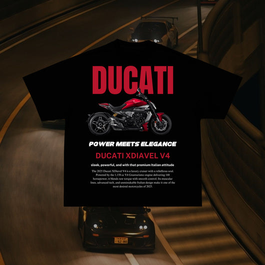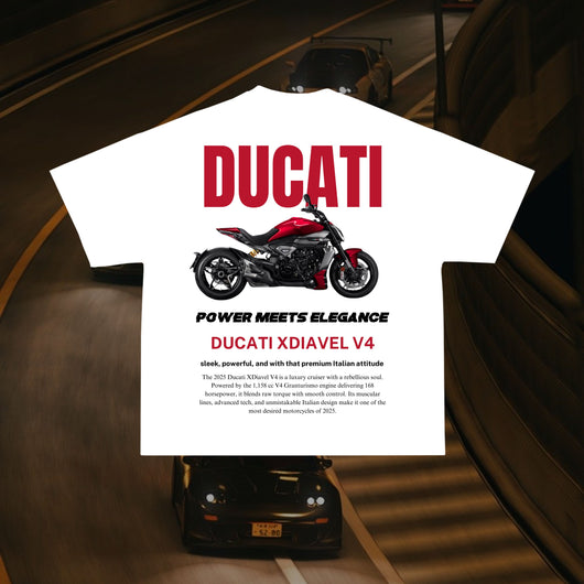 Confeccionada a mano en Barcelona con algodón premium de 190 g/m², esta camiseta combina artesanía y tecnología, igual que Ducati une potencia V4, precisión italiana y carácter inconfundible. Su estampado DTF de alta definición reproduce la silueta agresiva y elegante de la XDiavel V4 con un acabado impecable y duradero.